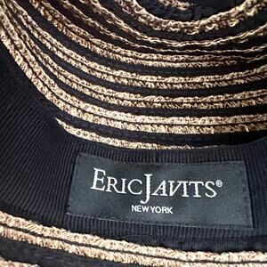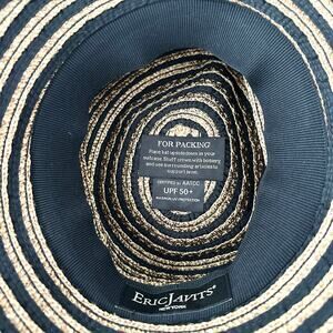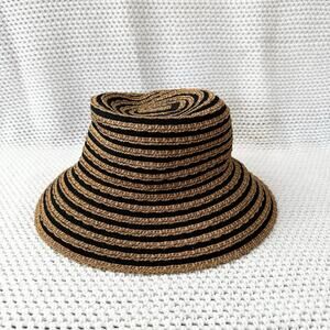 One size from Eric Javits. Beige and tan striped squishee packable straw bucket hat. With UPF 50 built in. Preowned in good condition with no stains or tears.