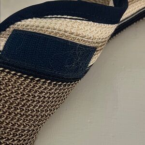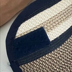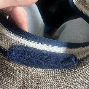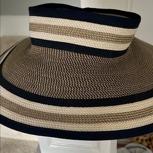 Stylish hat with navy gold and tan stripes. Perfect for adding flair to any outfit.