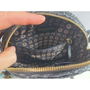 Eric Javits Canteen Style Black Woven Shoulder Bag w/Feather Details 9" Across
