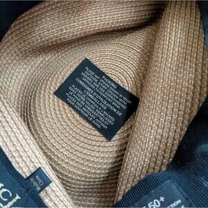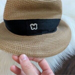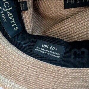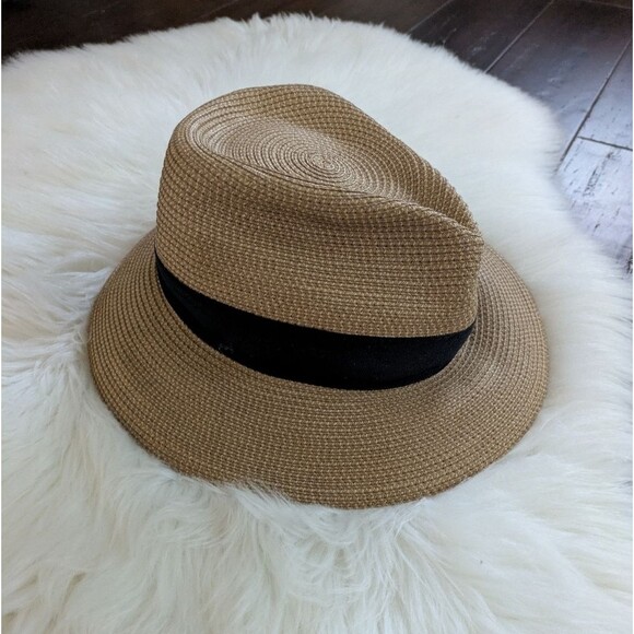 Stylish tan fedora by Eric Javits. Features a bold black band. Perfect for versatile wear.