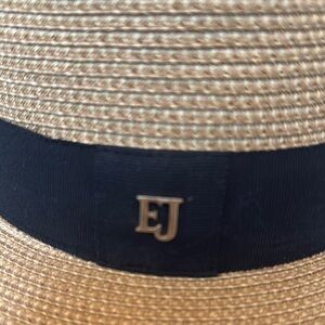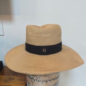 Excellent condition. Retail is $385. 22 1/4” inner circumference, 4” brim. Color: natural/black. Grosgrain ribbon trim provides a refined finishing touch for this sun hat woven from Eric Javits' signature packable straw for chic, travel-ready style.