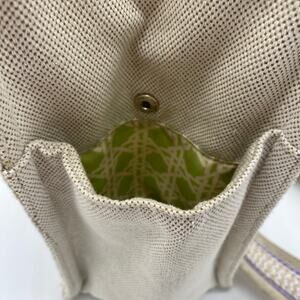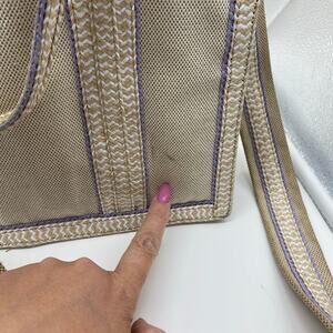 Eric Javits New York Lil Côte d’Azur Beige Purple Tote Bag Canvas Shoulder Bag. Eric Javits brand women's purse. Beige colorway with purple details. Lined on the inside in a green patterned print. Handles at the top and optional shoulder strap. Gold hardware. Zipper closure across the top. Discoloration marks as pointed out. Measurements as pictured. In great pre-owned condition, see photos for more details. Always feel free to ask any questions you may have! Reasonable offers accepted.