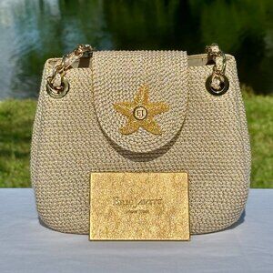 Eric Javits Raffia Sand Dollar Top Handle Chain Strap Gold Metallic Bag