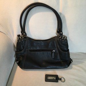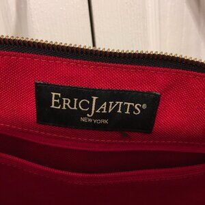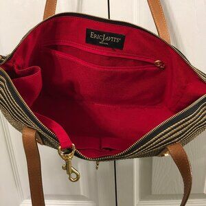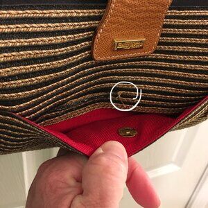 Black/tan Eric Javits Squishee woven straw shoulder bag with leather handle and trim, red fabric lining. Top zipper closure, one outside small pocket with a missing magnetic closure (see last photo). Inside has 3 pouch pockets, 1 zipper pocket. 5 ball feet on the bottom. This bag has been used very little and is very clean inside and out.