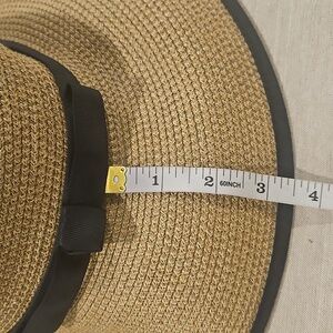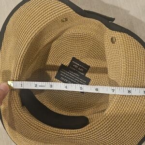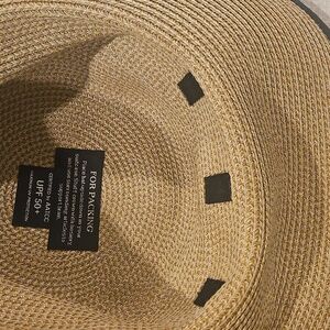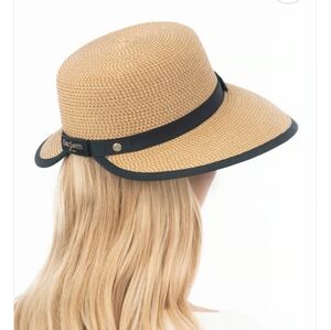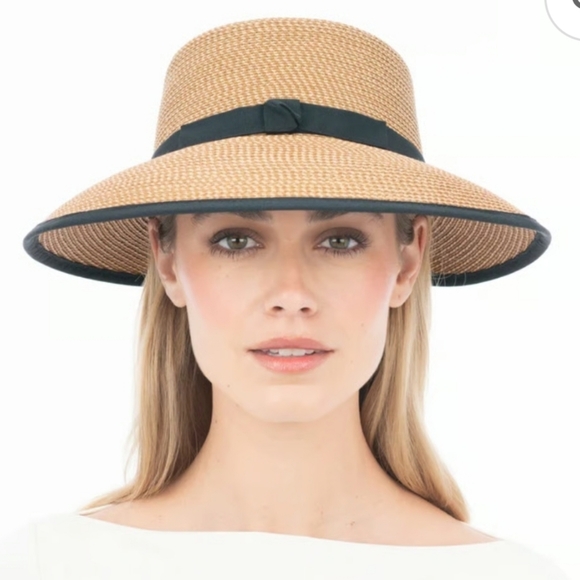 Stylish wide brim hat by Eric Javits. Features a tan body with a sleek black band. Perfect for sun protection.