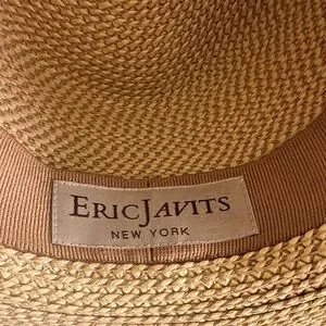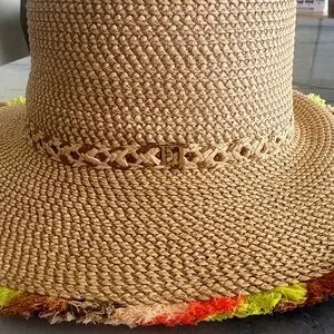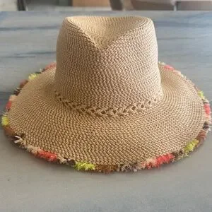Stylish Eric Javits straw sun hat in tan. Wide brim with playful multicolor fringe trim. Lightweight woven design for effortless summer wear. Neutral base pairs well with bright accents.
