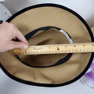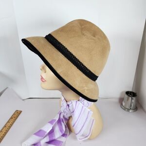 Stylish tan hat with black trim and tassel detail. Elegant design by Eric Javits.
