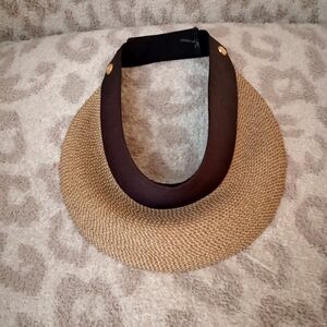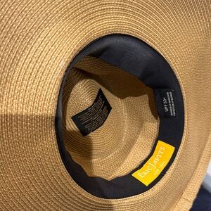 Stylish wide-brim hat by Eric Javits. Features a tan body with a black band. Perfect for sun protection and fashion. Some stains you can try to remove it.