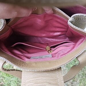 Straw top handle bag with brown leather straps and accents. Gold colored hardware and gold metallic threads mixed in with the straw. Pink interior has two compartments, including an inner zip pocket. One small exterior slip pocket