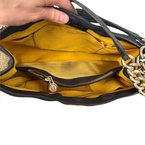 Gold and black shoulder bag with chain handles. Three compartments-middle one with zipper.