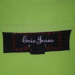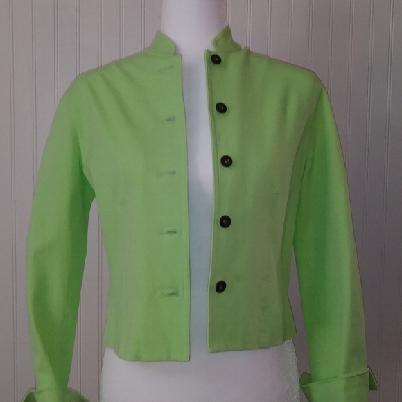 Lime green button front jacket with stand up collar. Folded cuffs on the sleeves. 94% cotton and 6% spandex. Very comfortable! In great condition and no flaws. Dry clean only.