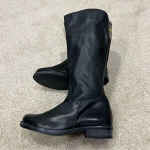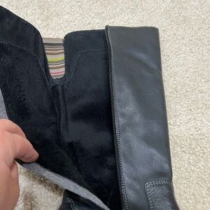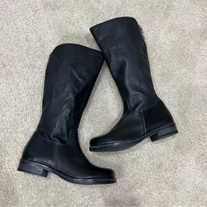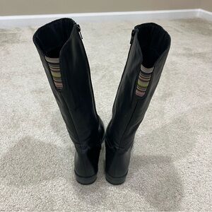 Elegant black leather boots. Knee-high design. Comfortable heel. Perfect for any occasion. Would love to keep them, but too small for me, so resized them in posting to an 8. Design on back is unique and distinguishable. Up to $8 credit for return shipping if not a fit. Comfortable feeling leather. Excellent condition, like not worn.