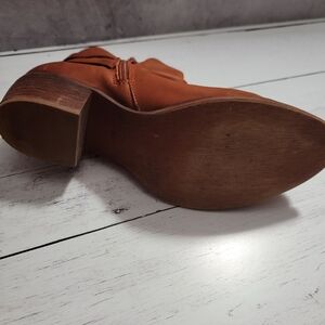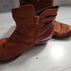 Made in Portugal. These western inspired, slouch booties made from 100% leather are gorgeous in rust with a burnished toe. The heel measures approximately 1 1/2" heel.