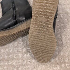 Black leather mid height ankle boots with inside zipper closure and durable rubber crepe outsole. Heel is approximately 1.25 inches with 0.75 inch platform.