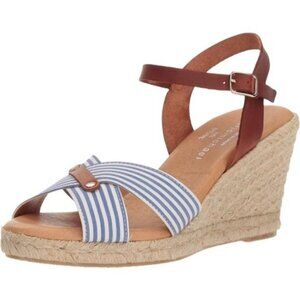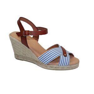 Blue and white striped canvas toe strap and brown leather heel strap