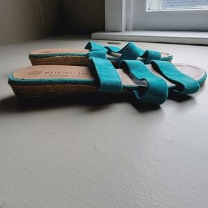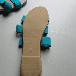 Turquoise triple strap, suede sandal with espadrille bottom, Size 40 (81/2-9).