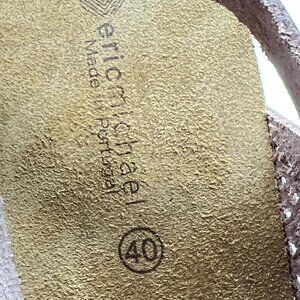 Eric Michael women's taupe leather perforated low wedge open toe sandals. Women's size 40 EU, which is equivalent to a 9.5 US. Listing as both sizes, but only the one pair is available.