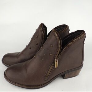 Brown leather ankle boots with vintage brass colored studs and zippers