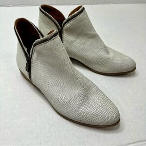 Eric Michaels Off White Reptile Ankle Boot in excellent condition - gently worn with no flaws. Off white reptile textured boots, functional zippers on inside and outside. Pointy toe and 1/2” heel.