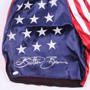 Eric “Butterbean” Esch transitioned to professional boxing in 1994 following a successful stint on the Toughman Contest scene and went on to capture the World Athletic Association (WAA) heavyweight and IBA super heavyweight championships. Everything is sewn onto these custom in ring style trunks. Hand-signed and inscribed in silver paint pen by Eric "Butterbean" Esch. The lot/autograph includes an official James Spence Authentication (JSA) hologram and matching COA for authentication purposes.