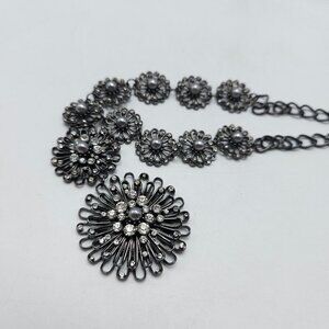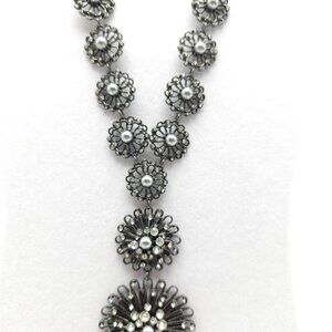 This necklace is a bold accessory designed to enhance formal or evening wear. Its intricate floral design with rhinestone and faux pearl accents adds elegance.