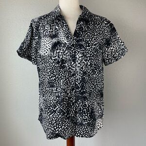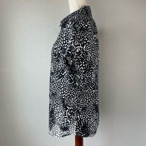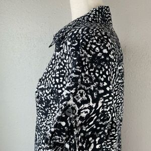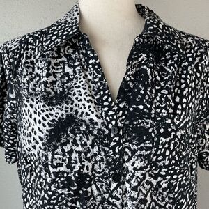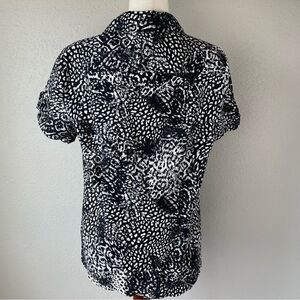 Stylish black-and-white button down top by Erika measuring 20 inches armpit to armpit when laying flat and 24 inches in length from the shoulder to the hem.