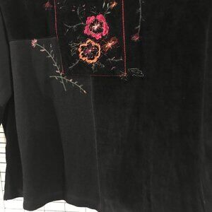 This woman's top is embroidered with flowers in a frame and leaves around.
