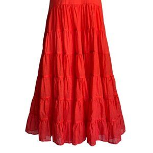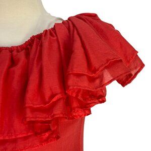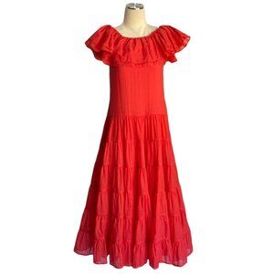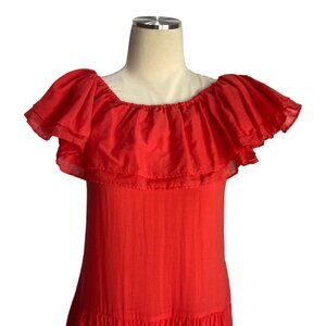 Erika Pena Red Rita Bohemian Maxi Dress has a sweeping silhouette and a ruffled neckline that can be worn on or off the shoulders. New with tags. Stunning maxi dress made with two layers of a lightweight voile cotton create a flowy, feminine look. Side slant pockets. Pullover styling. Pair with any belt for a more tailored look. Perfect dress for a wedding, vacation, special occasion or just to feel beautiful. Please see pictures for more details and measurements. The size is XS/S.