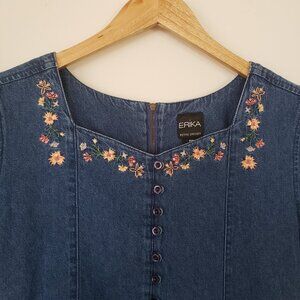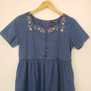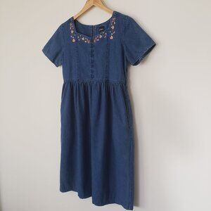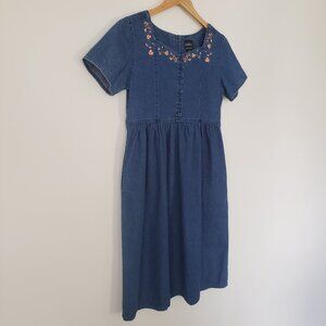 Erika Size Medium Petite Vintage 90's Denim Embroidered Flowers Teacher Dress