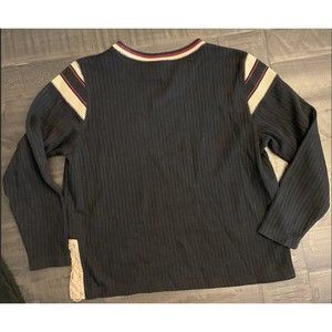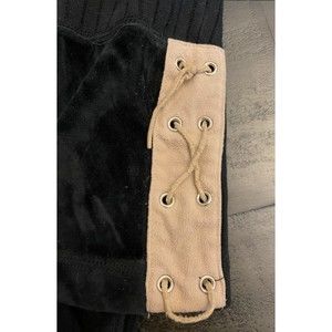 Nice and stretchy, ribbed texture. Velour bottom of the shirt in front. Faux suede panel on each side. Ties on the side. One side is missing the string.