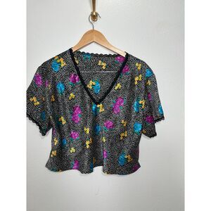 Erika Taylor Blouse Women's size Large Black Floral Satin V Neck Lingerie Femme