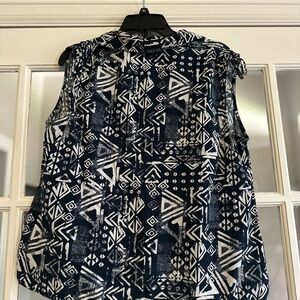 This Erika blouse features a striking white and blue graphic design, perfect for adding a modern touch to your wardrobe. The sleeveless cut and notched collar offer a chic and sophisticated look. Ideal for those who love a blend of contemporary style with unique graphic elements.