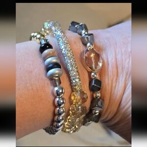 Pretty Erimish 7 1/2" - 3 stretch bracelets set glitter and glow. Add a touch of sparkle! New in original packaging. Stones, crystals, and beads. Originally $21.
