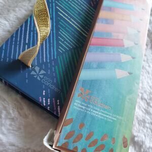 •The packaging features a decorative design with a watercolor-like background and metallic accents.