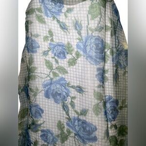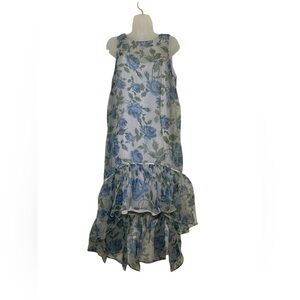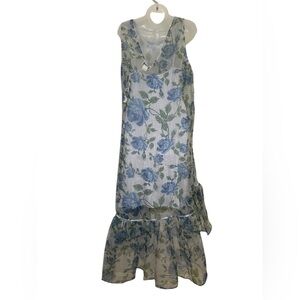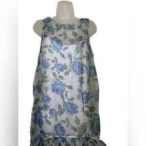 Dress has attached lucky blue lining dress with adjustable straps. Sheer overlay with blue hydrangeas and checkered print. High low hem.