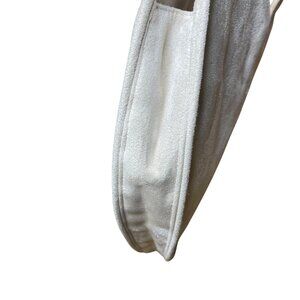 Features: Ivory faux suede fabric, two handles, magnetic closure, a whimsical lining patterned of a girl's face and small hearts, a zip pocket and two slip pockets on the inside.