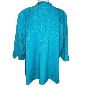 Erin Aqua Blue Textured Jacquard Linen Blend Half Sleeve Button Tunic Top Plus Size 3X Shoulder Pads