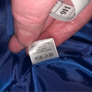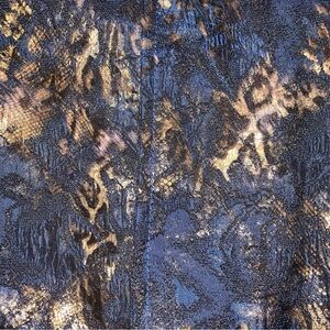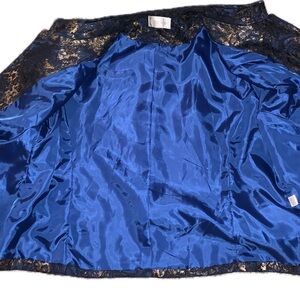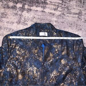 Elegant blue jacket with gold accents. Intricate pattern. Perfect for stylish outings. Please note the measurements: 25” pit-to-pit, 17” across shoulders. Single eye-hook closure (circled in pictures) allows for generous sizing. I believe you could be a 1X in this.