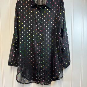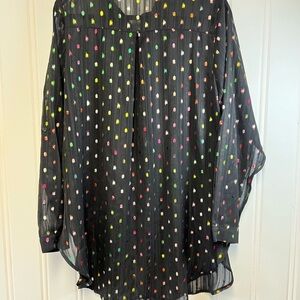 Chic black blouse with vibrant dots. Lightweight, Sheer and stylish. Ideal for any event. NWT. measures 22p and 33l