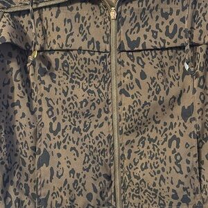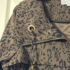 Erin London leopard print jacket. Full zip, front pockets, and drawstring accents. Size large. Armpit to armpit is 22 inches. Back of neck to bottom is 23 inches long. 97% polyester 3% spandex. Like new condition!