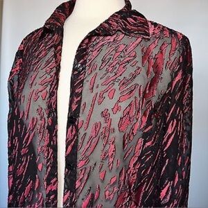 ERIN by Erin London long sleeve blouse. Made from a rayon blend, this diaphanous blouse can be worn buttoned down or as a layering piece over a cami. Features small side slits.