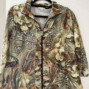 Chic jacket with a vibrant pattern. Features a blend of green, brown, and tan hues. Ideal for a bold fashion statement. Make an offer!