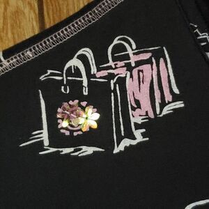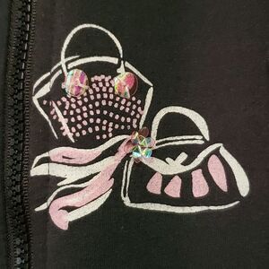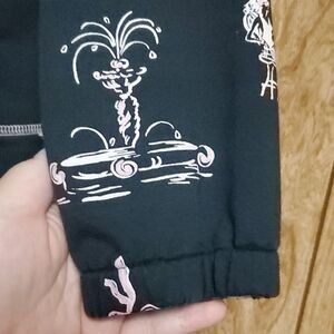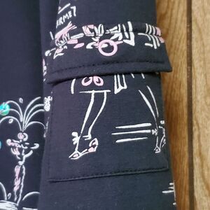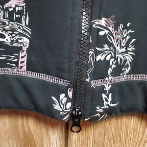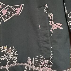 Absolutely darling jacket from Erin London. Black, with a pink and white Parisian print. Many of the front designs are accented by iridescent sequins. The jacket has two front pockets, a small sleeve pocket, and a two-way zipper.