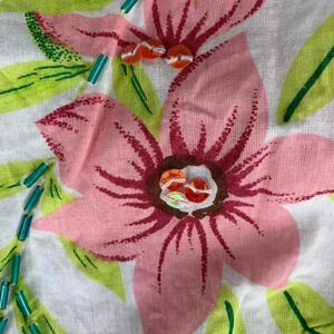 Excellent condition. Beaded embellishments and pretty tropical print on sheer white cotton. resort wear. Vacation