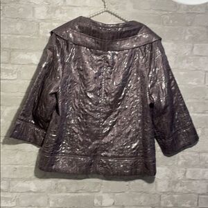 Size Medium. Beautiful Pewter and Silver Shimmer jacket. Round Peter Pan Style Collar. Features 3/4 length Sleeves and silver hardware. Zips up front in excellent preowned condition, no flaws, barely worn.
