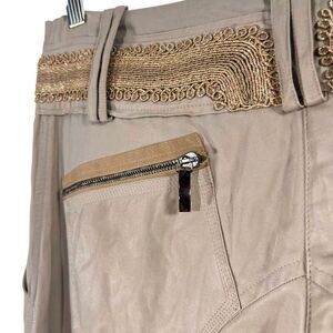 Stylish tan cropped pants featuring gold accents. Perfect for any occasion.