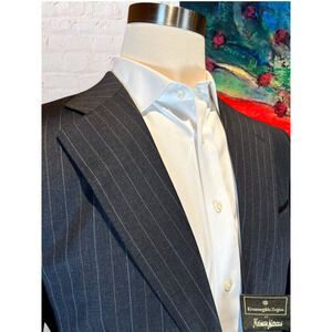 Elevate your wardrobe with the sophisticated Ermenegildo Zegna two-piece suit. Crafted from the finest worsted wool - Super 100s this suit features a timeless rich charcoal gray with a subtle burnt orange and light gray dashed stripe, perfect for adding a touch of elegance to any occasion. Designed for the discerning gentleman, the suit features a notch lapel and a pleated front pant. Attention to detail is evident in the single-breasted, two-button jacket cut, four-button sleeve styling, and ventless design, offering a polished and professional look.