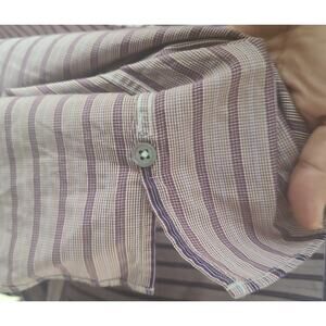 This dress shirt is made from 100% cotton fabric with a subtle sheen. It features two pattern styles: purple and blue stripes, and a brown checker pattern. The shirt has two side vents, a hidden button collar, a chest pocket, and rounded cuffs. It also comes with one extra button.