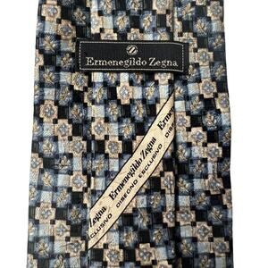 Ermenegildo Zegna Blue Tan Geometric Floral Print 100% Silk Neck Tie