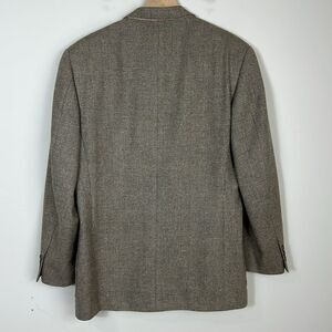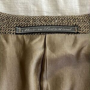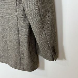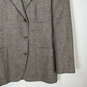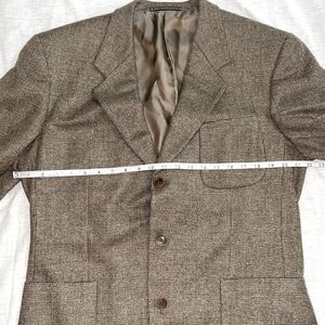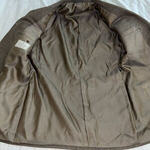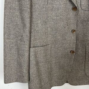 Classic brown blazer. Features notched lapels. Three-button closure. Front pockets.